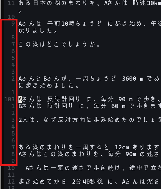 例えば、カーソルがある行を真ん中に置くと、左端の行番号はこんな感じになります。